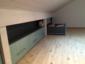 Et ce que c’est devenu après la pose d’un parquet, du lambrissage et de l’agencement sur mesure avec des grands tiroirs, un lit qui se dissimule dans la sous-pente et des portes coulissantes.