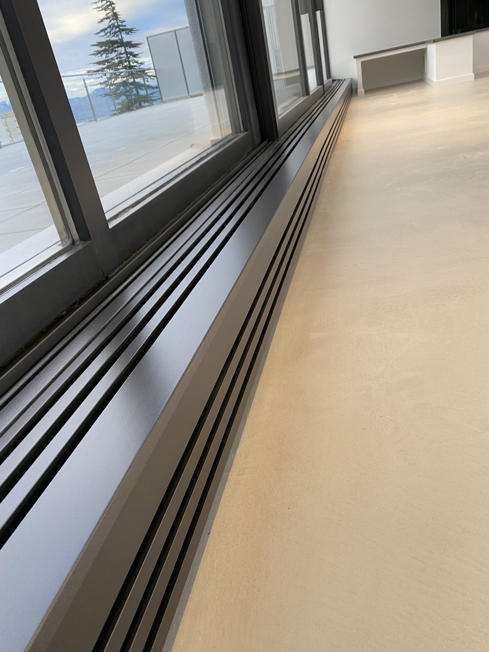 Certains radiateurs ont besoins d’être cachés, ceux-ci, long de 5 à 6 mètres ont été dissimulé avec des caches sur mesure laqué gris métallisé, les vannes et purgeurs reste accessibles par des trappes discrètes.